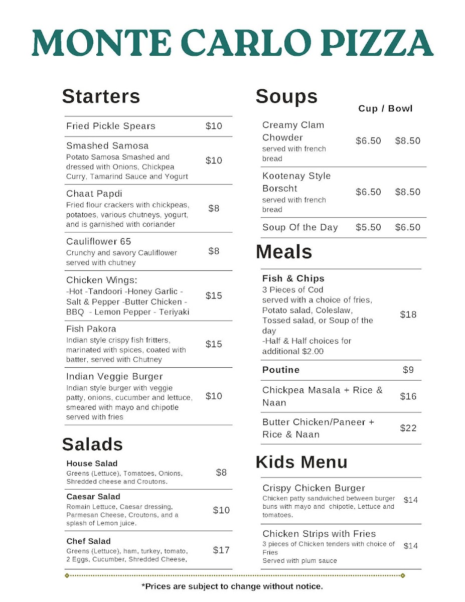 Welcome to Monte Carlo Grill & Pizza, your new favorite destination for hearty meals in Castlegar, BC. Nestled at 1935 Columbia Ave, this vibrant eatery offers a diverse menu that caters to all taste buds. Enjoy a comforting plate of Fish and Chips, featuring three pieces of cod, or indulge in the rich flavors of Butter Chicken and Butter Paneer, both served with aromatic rice and naan.